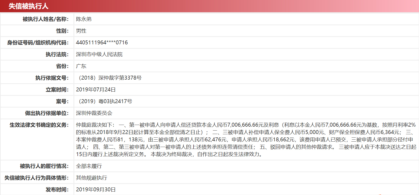 陈永弟较近一条失信信息发布于今年9月30日,案号(2019)粤03执2417号,执行法院为深圳市中级人民法院,被执行人的履行情况为“全部未履行”,失信被执行人行为具体情形为“其他规避执行”。