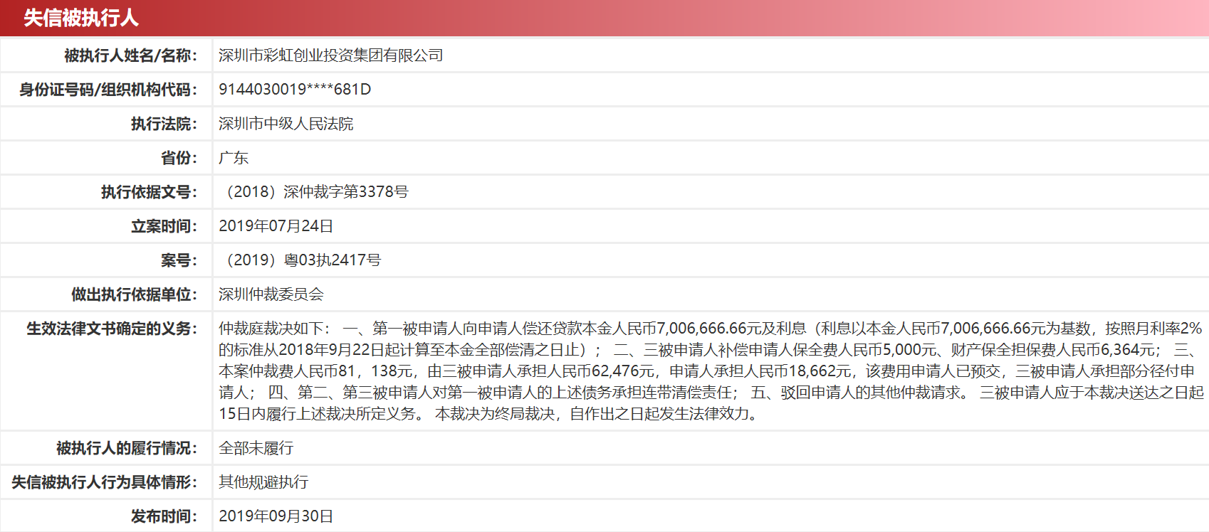 彩虹集团较近一条失信信息亦发布于今年9月30日,案号与上述陈永弟失信信息相同为(2019)粤03执2417号。