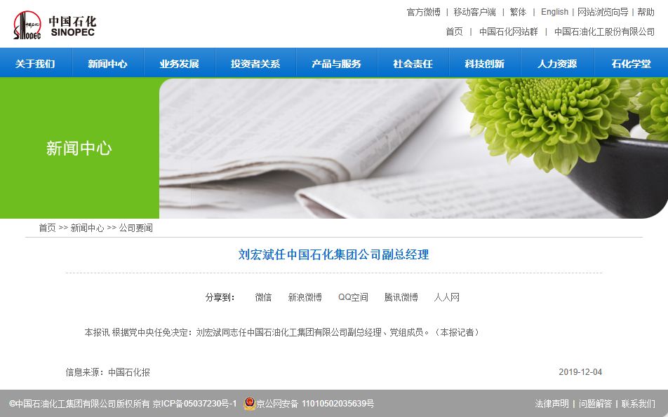 12月4日,中石化集团宣布消息,根据党中央任免决定:刘宏斌同志任中国石油化工集团有限公司副总经理、党组成员。