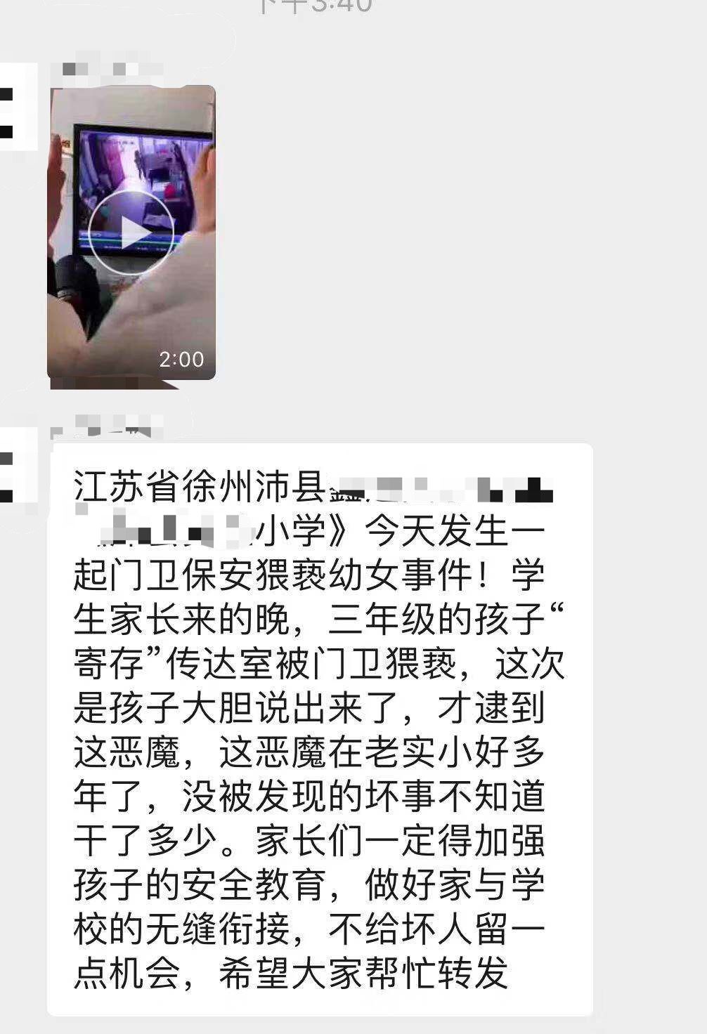 12月3日,有网友爆料称,江苏沛县小学发生一起保安猥亵女童事件,“学生家长来得晚,三年级的孩子在传达室被门卫猥亵。”