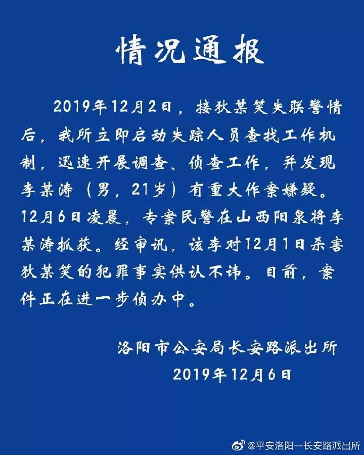 今日11时许,洛阳市公安局长安派出所官方通报称,狄某笑失联后派出所启动失踪人员查找工作机制,迅速开展调查、侦查工作,并发现李某涛(男,21岁)有重大作案嫌疑。12月6日凌晨,专案民警在山西阳泉将李某涛抓获。经审讯,李某涛对12月1日杀害狄某笑的犯罪事实供认不讳。目前,案件正在进一步侦办中。