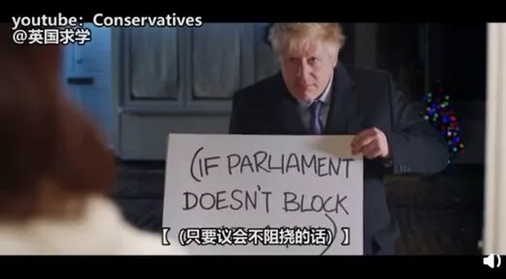 视频中,约翰逊来到一户人家门口。当女主人打开门后,约翰逊开始播放圣诞颂歌并拿出标语卡片向女主人展示。标语卡片上写着:“运气好的话,明年我们将完成脱欧”,“我们只需再拿下9个席位就能赢得多数党地位”等等。