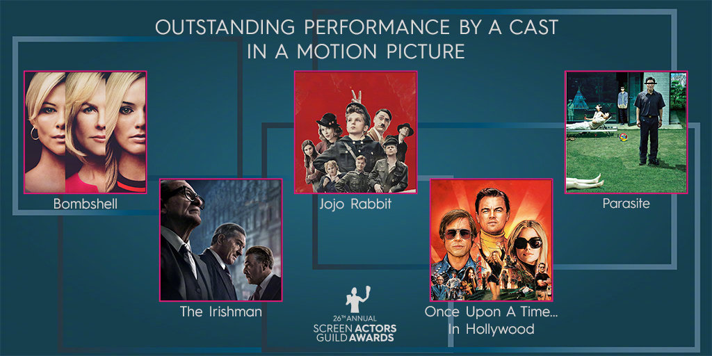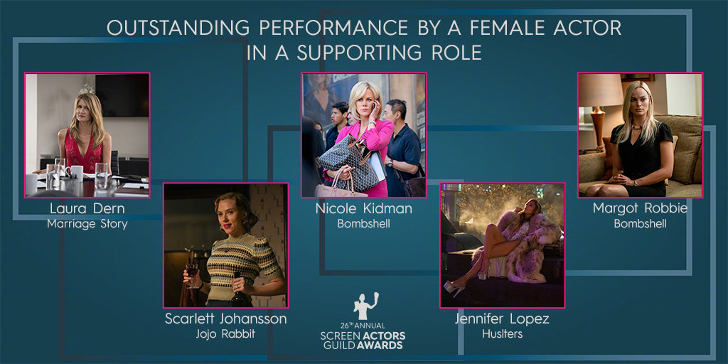 新京报讯 12月12日,第26届美国演员工会奖提名名单揭晓。电影类提名中,《爆炸新闻》《好莱坞往事》《爱尔兰人》以4项提名领跑。斯嘉丽·约翰逊凭借《婚姻故事》和《乔乔兔》获得了最佳女主角和最佳女配角的提名。《小妇人》《别告诉她》《教宗的继承》《1917》等热门影片未获提名。
