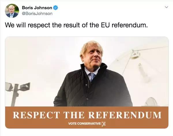 12月12日一早,约翰逊在推特发文:“我们会尊重‘脱欧’公投的结果。”