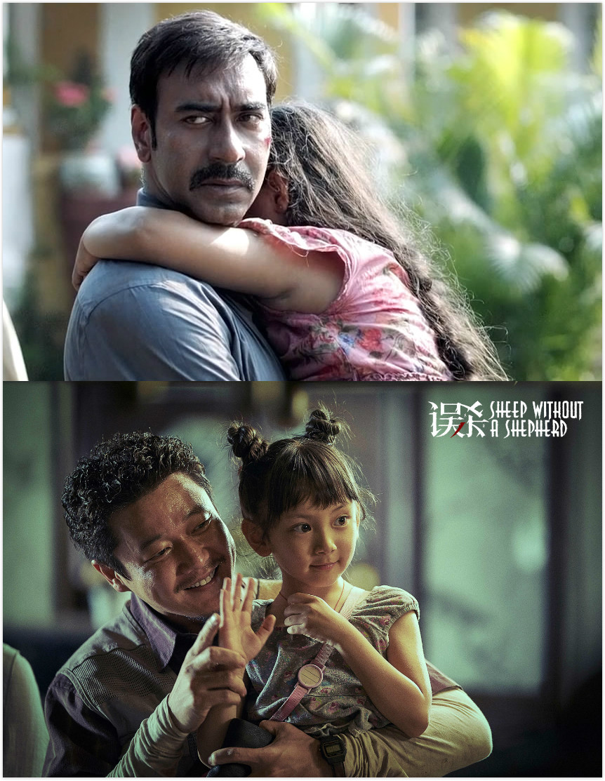 印度版《误杀瞒天记》剧照和中国版《误杀》剧照,图为男主角和女儿。