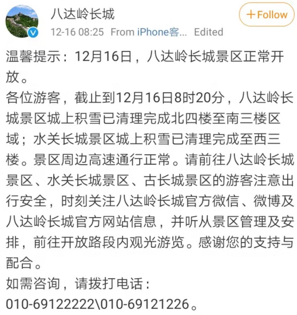 八达岭长城官博特别通知,今日景区正常开放。