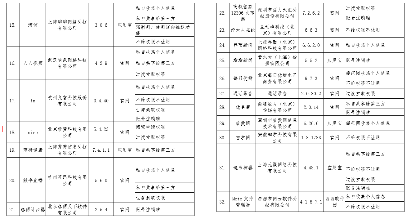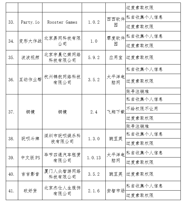 截至目前,尚有41款APP存在违规收集、使用用户个人信息、不合理索取用户权限、为用户账号注销设置障碍等问题(详见附件),未完成整改。上述APP应在12月31日前完成整改落实工作,逾期不整改的,我部将依法依规组织开展相关处置工作。