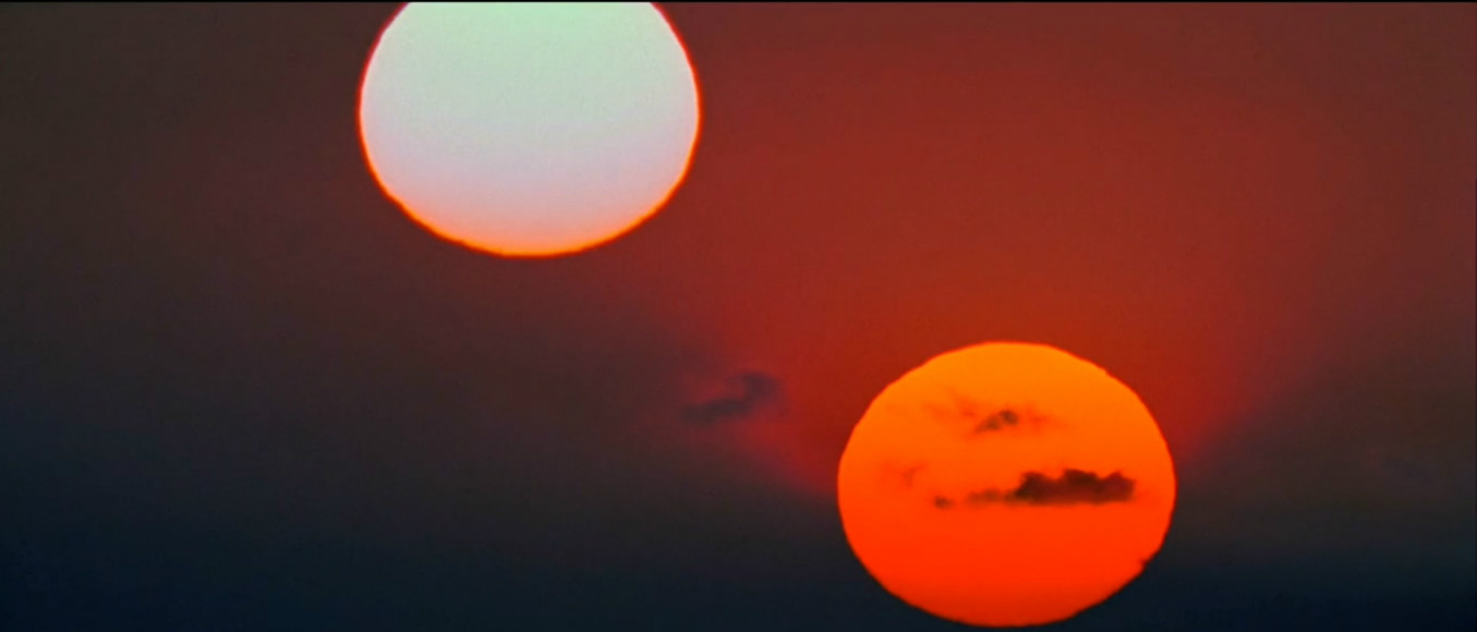 影片最后以两个太阳交映的画面结束,呼应1977年《星球大战:新希望》中卢克眺望红日的场景。