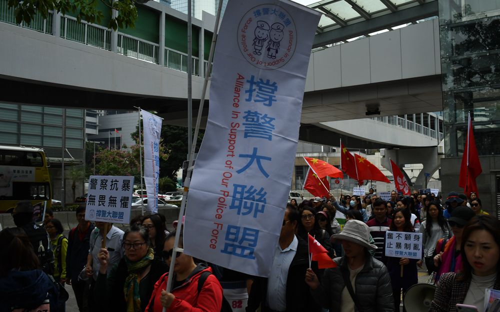 12月20日下午,香港民间团体“撑警大联盟”在香港金钟地铁站附近集合,游行至港府总部,向立法会议员递交支持香港警察的请愿信,财委会委员、立法会议员黄定光接收请愿信。