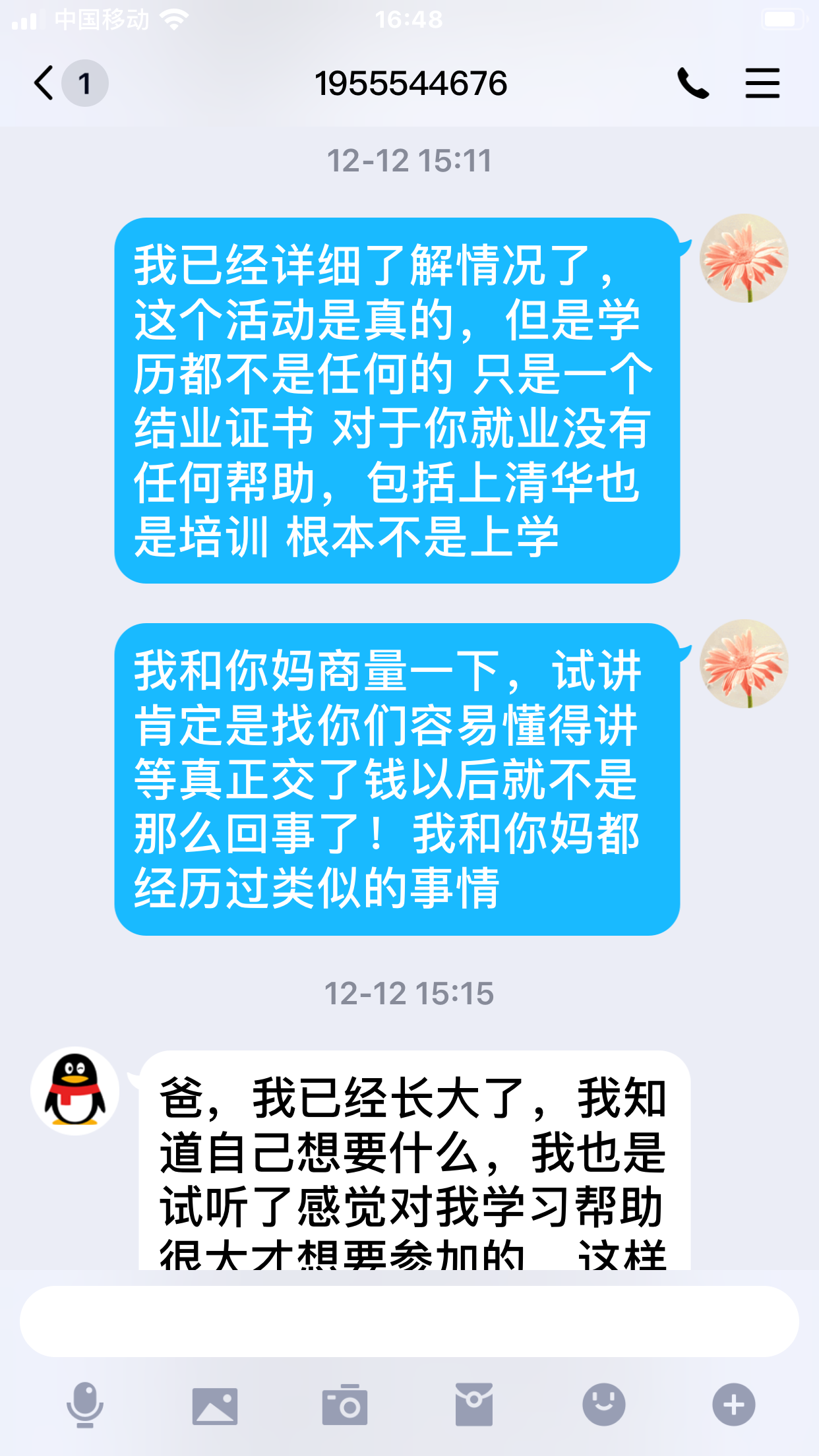 与此同时,“女儿”也在催促张先生尽快报名。张先生与“女儿”的聊天记录显示,张先生试图以“仅仅是一个培训班”“对就业没有任何帮助”等理由劝说“女儿”放弃报名,并要求与“女儿“电话沟通。“女儿”以正在上计算机课为由拒绝通话,并用“我不报了行了吧,不给你们增加负担了”“父母不理解不支持,我想退学”等话语回复张先生。