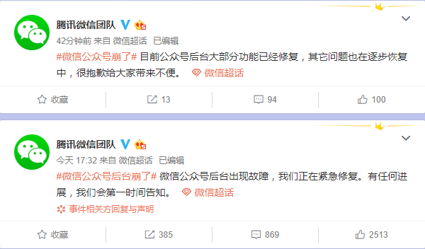 微信:大部分功能已经修复,其他问题也在逐步恢复中