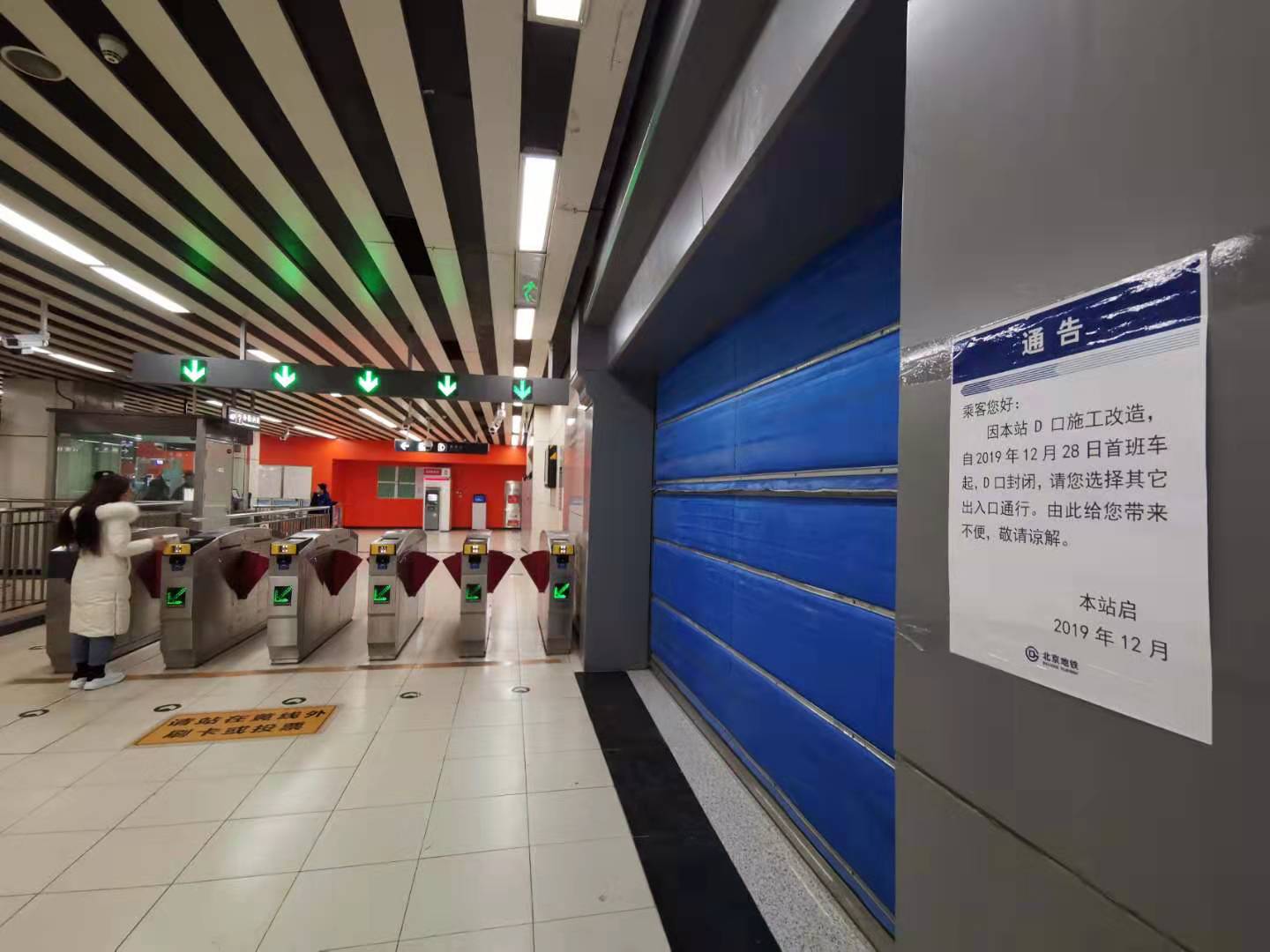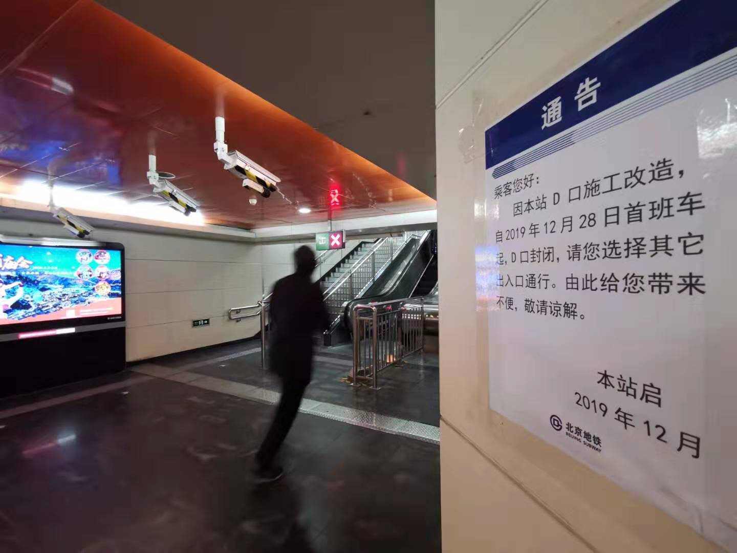 近日地铁10号线双井站内张贴了一则通告,“因本站D口施工改造,自2019年12月28日首班车起,D口封闭,请您选择其它出入口通行。由此给您带来不便,敬请谅解。”