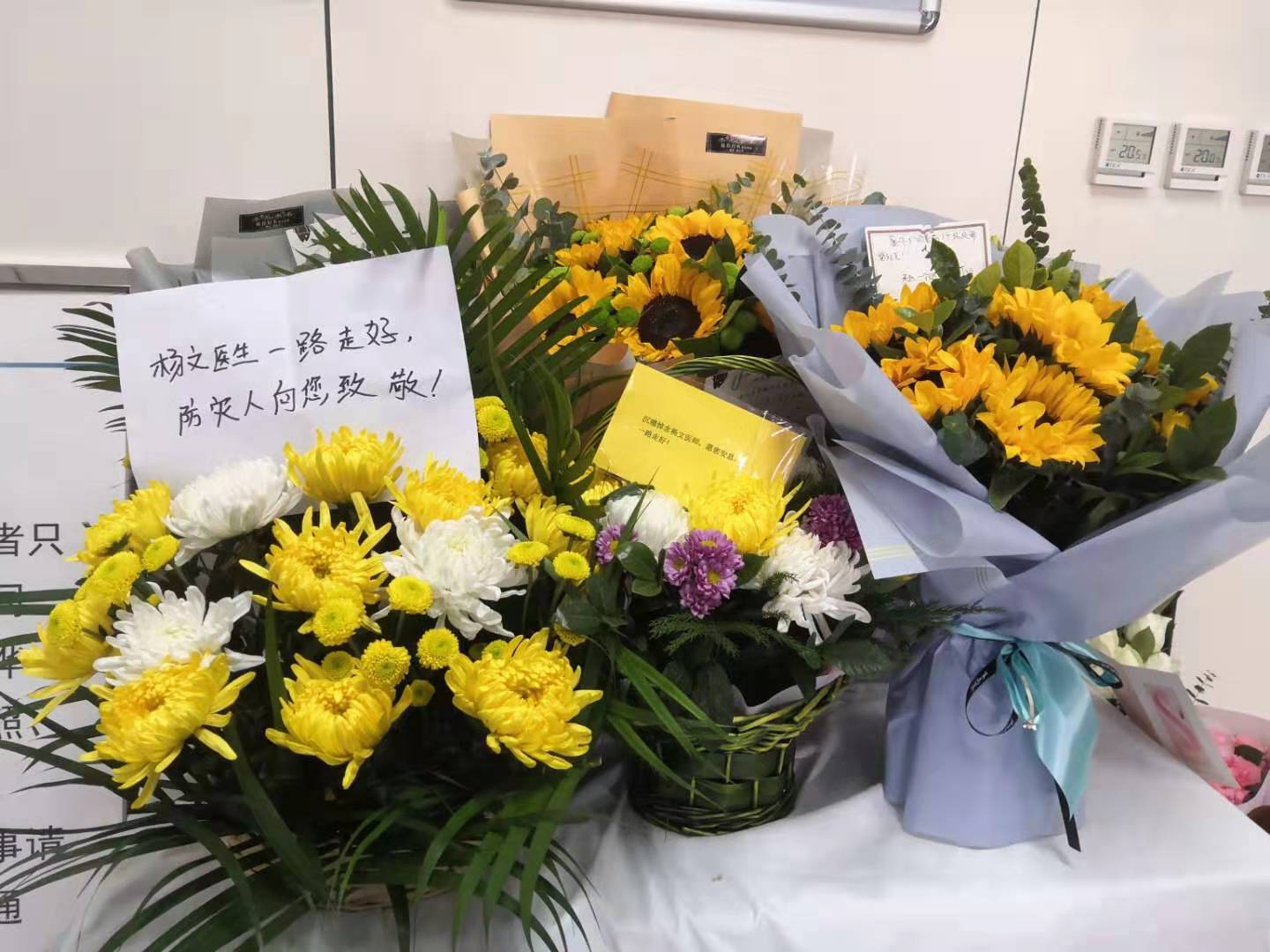 王华和张芳站在鲜花前矗立良久,眼眶湿润。二人是在校大学生,家人都从医。王华说,发生了这样的事情,自己感同身受,想来医院看一看,献上一束鲜花。