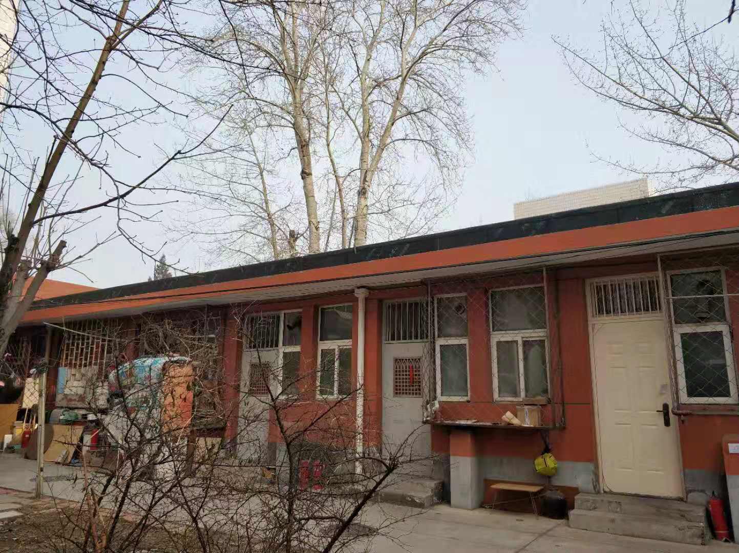 新京报记者在上述住址走访看到,平房位于北京第二外国语学院校内。红色外墙,铝合金门窗,每一户人家有独立的单元门。门前是一片水泥地,正对着草地。门外的空地上,堆放着旧沙发等杂物,洗手池等设施位于户外靠墙角处。从建筑外观上,房龄至少超过三十年。