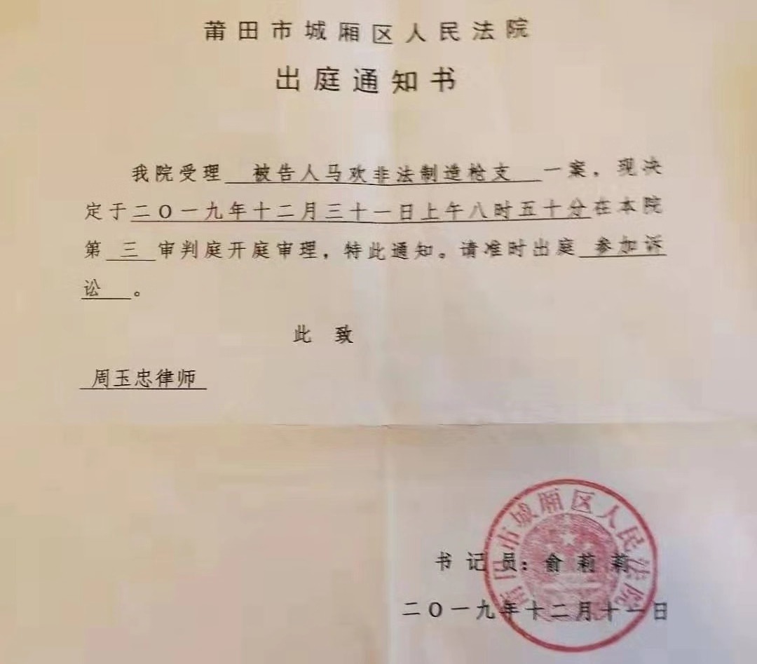 今日(12月30日),新京报记者从马欢家属及其辩护人处获知,12月23日,家属一方收到由城厢区法院出具的《出庭通知书》,文书显示,被告人马欢非法制造枪支一案,决定于2019年12月31日上午在该院开庭审理。