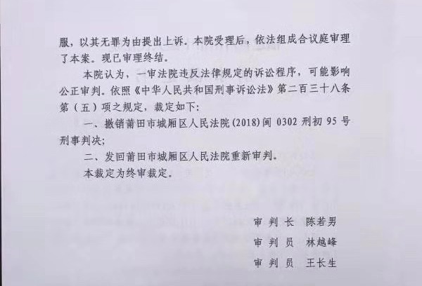莆田中院二审刑事裁定书显示,原审程序违法,发回重审。 受访者供图
