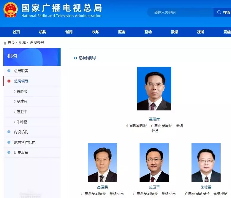 目前,国家广播电视总局局长由中宣部副部长聂辰席担任。包括朱咏雷在内共有3名副局长,另外两位为高建民、范卫平。
