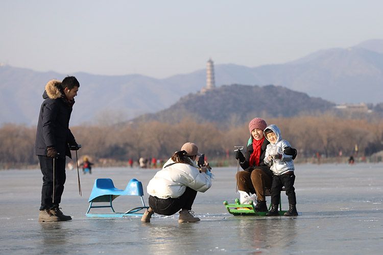 冰场上游客与皇家园林拍照合影。
