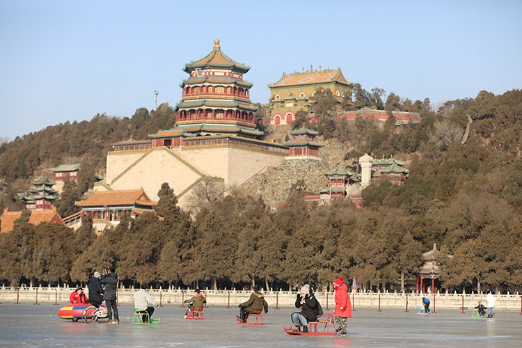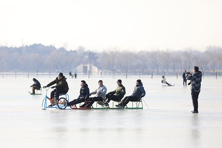 颐和园冰场上,游客们在滑冰车。