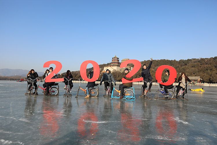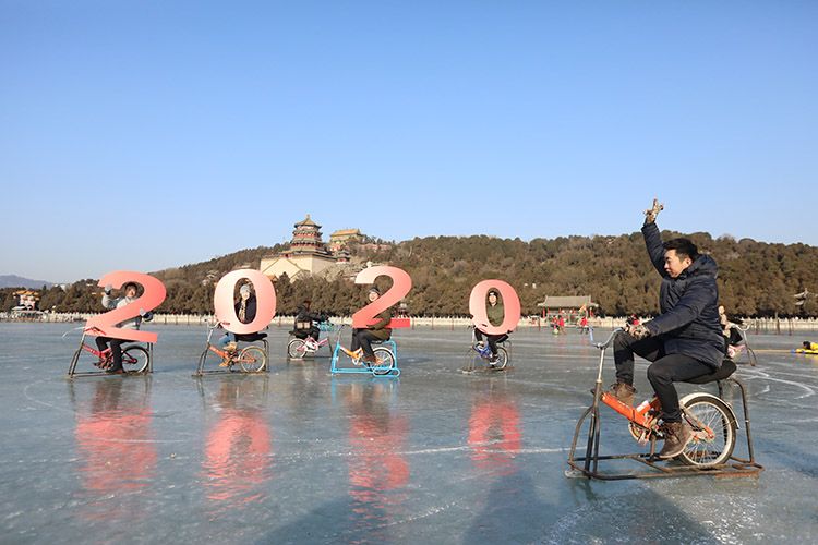 新年伊始,游客们在昆明湖冰场上欢庆2020年元旦。