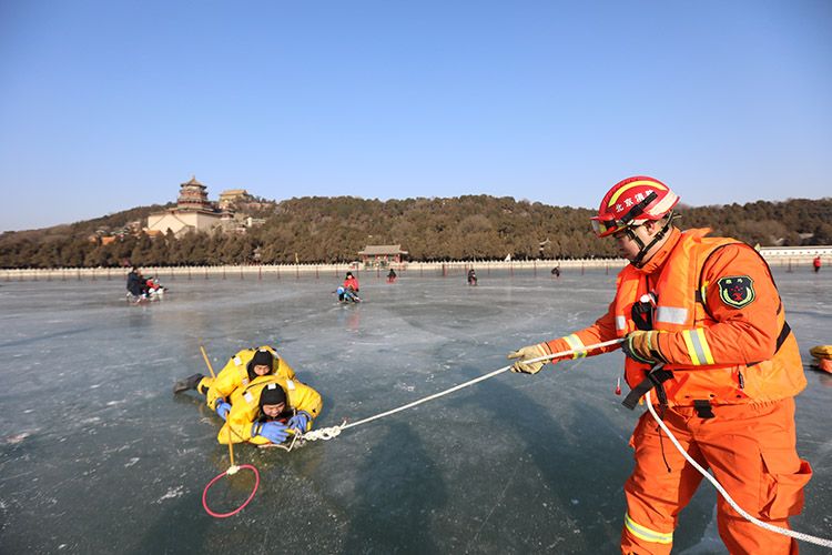北京消防工作人员在冰场进行安全演练。