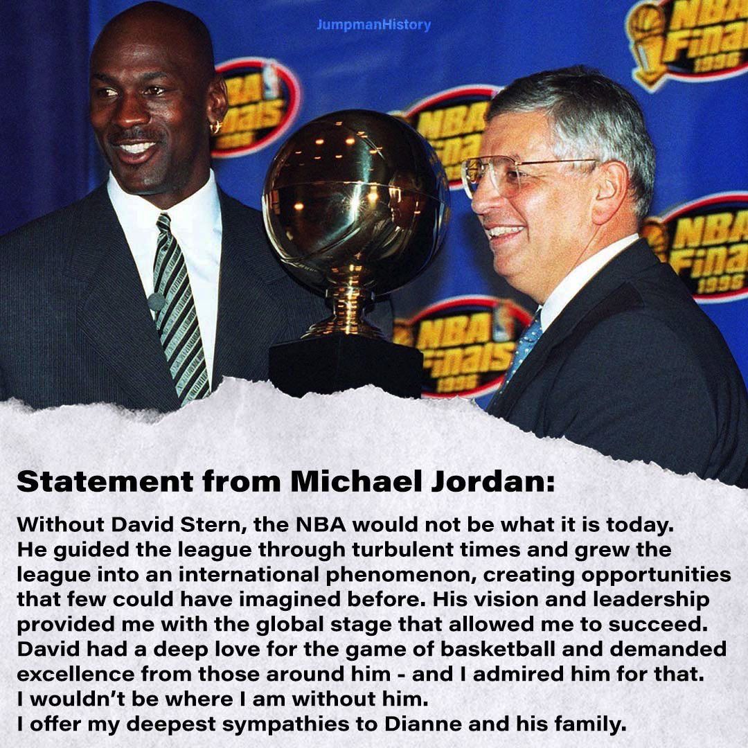 “没有大卫·斯特恩,NBA就不会是今天的样子。他带领NBA联盟度过了动荡时期,并将其发展成一个国际化的现象级联盟。”迈克尔·乔丹说。