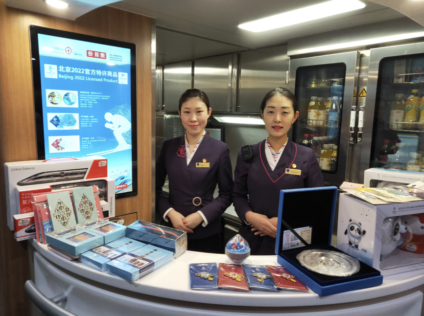 往返于北京北站和张家口站的冬奥专列,旅客不仅可以从车厢小推车选购北京冬奥会特许商品,在餐车车厢也设立了专区销售。