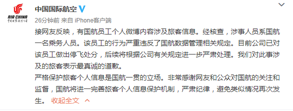 新京报快讯 据@中国国际航空 3日晚间消息,接网友反映,有国航员工个人微博内容涉及旅客信息。经核查,涉事人员系国航一名乘务人员。该员工的行为严重违反了国航数据管理相关规定。目前公司已对该员工做出停飞处分,后续将根据公司有关规定进一步严肃处理。国航同时对此事涉及的旅客致歉。