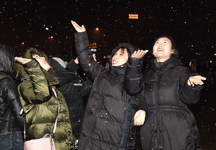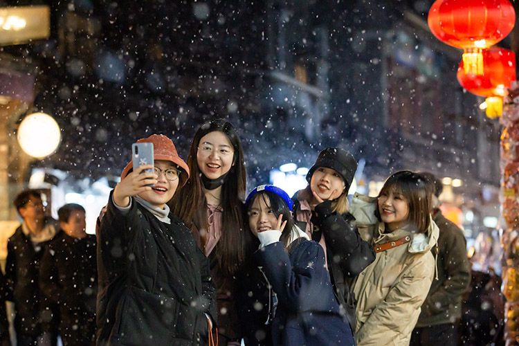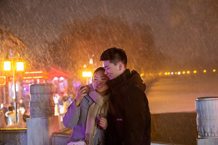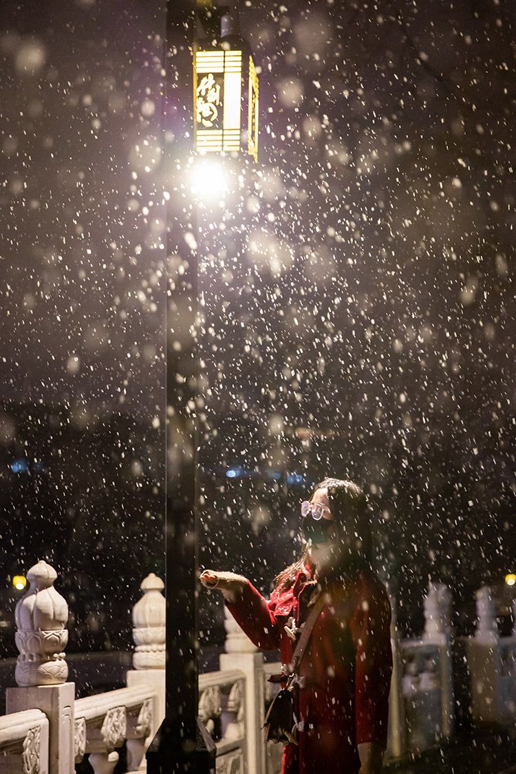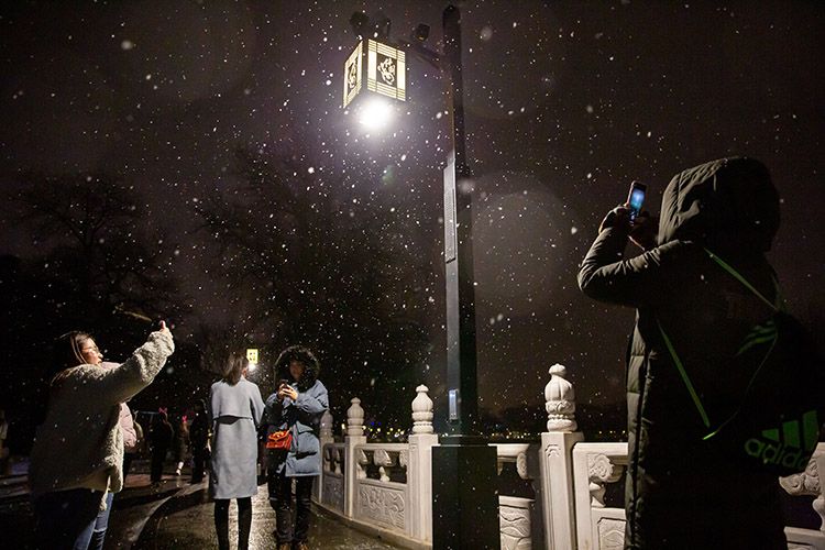 什刹海岸边,游客借着灯光拍照雪花飘落。