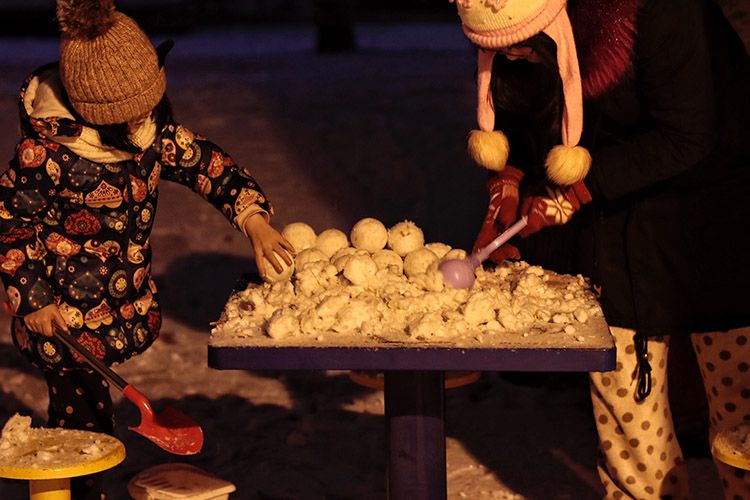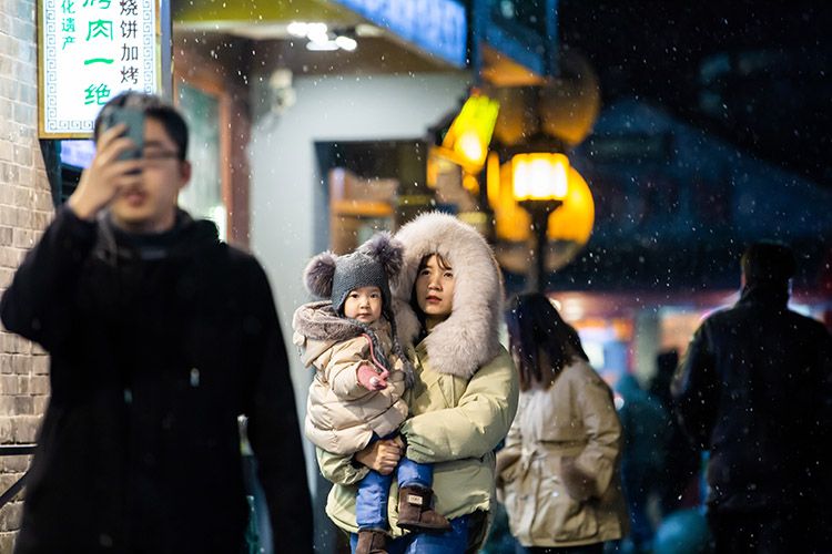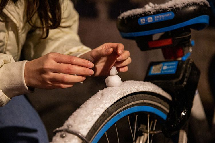烟袋斜街,一位广东游客兴奋地堆了个小雪人。