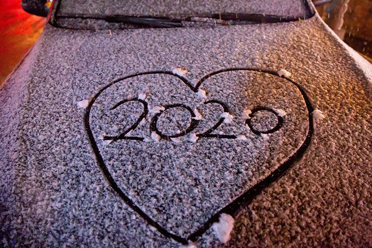 什刹海,汽车被白雪覆盖,人们在上面写下“2020”。