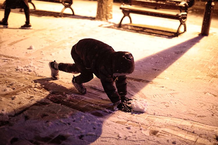 朝阳北路,一位小朋友正在兴奋地撮雪。