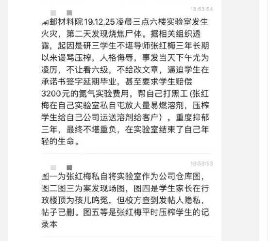 尚待权威证实的质疑显示,该研究生在生前,“被其女性导师谩骂和压榨,进行人格侮辱,不给修改论文,还被要求签延期毕业材料”;涉事导师“指使学生运送溶剂给自己公司的客户,要求学生赔偿3200元的氮气实验费用,导致学生重度抑郁”,“其在实验室里私自囤放大量易燃溶剂,将实验室作为公司库房……利用学生帮自己打黑工”,最终“因为不堪此重负”,研究生“选择结束了自己年轻的生命”。