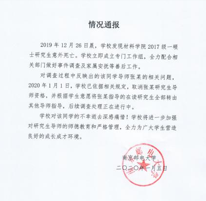 1月5日,南京邮电大学通过官微发布了一则通报。通报显示:2019年12月26日凌晨,该校材料学院2017级一硕士研究生意外身亡。针对调查过程中反映出的该研究生导师张某的相关问题,南京邮电大学已经于2020年1月1日,根据学校相关管理规定,取消了张某的研究生导师资格。随后,“南邮研三学生不堪重负圣诞节期间自杀”的话题冲上微博热搜,引发舆论广泛关注。