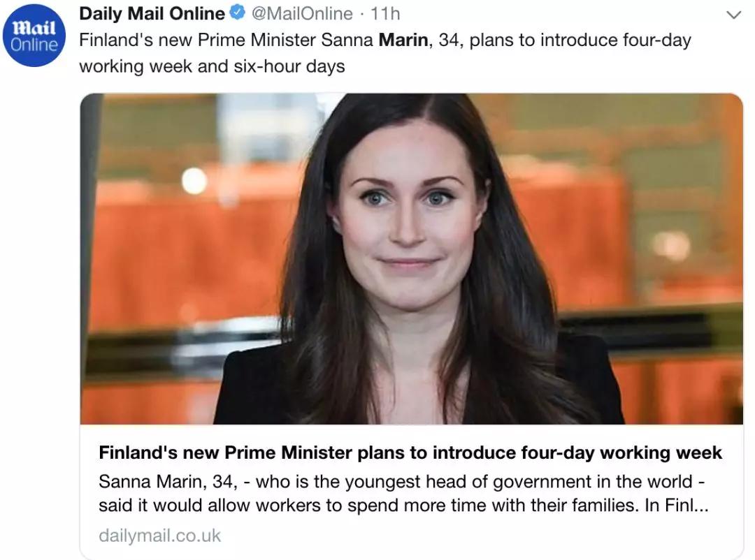 近日,新近上台的全球最年轻芬兰美女总理桑娜·马林提议,拟在芬兰实行“每周4天、每天6小时”的工作制度。