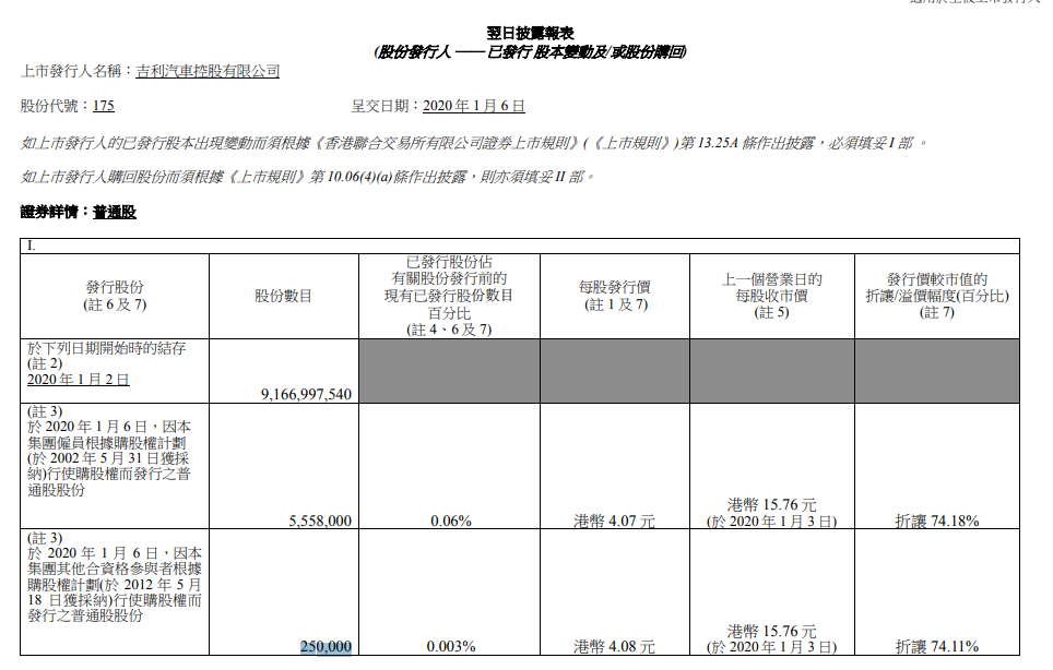 新京报讯(记者 刘阳 实习生 汪林)1月6日,吉利汽车披露,因集团雇员根据购股权计划(于2002年5月31日获采纳)行使购股权而发行555.8万股普通股,占已发行股份0.06%,每股发行价4.07港元,较上一个营业日每股收市价15.76港元折让74.18%。