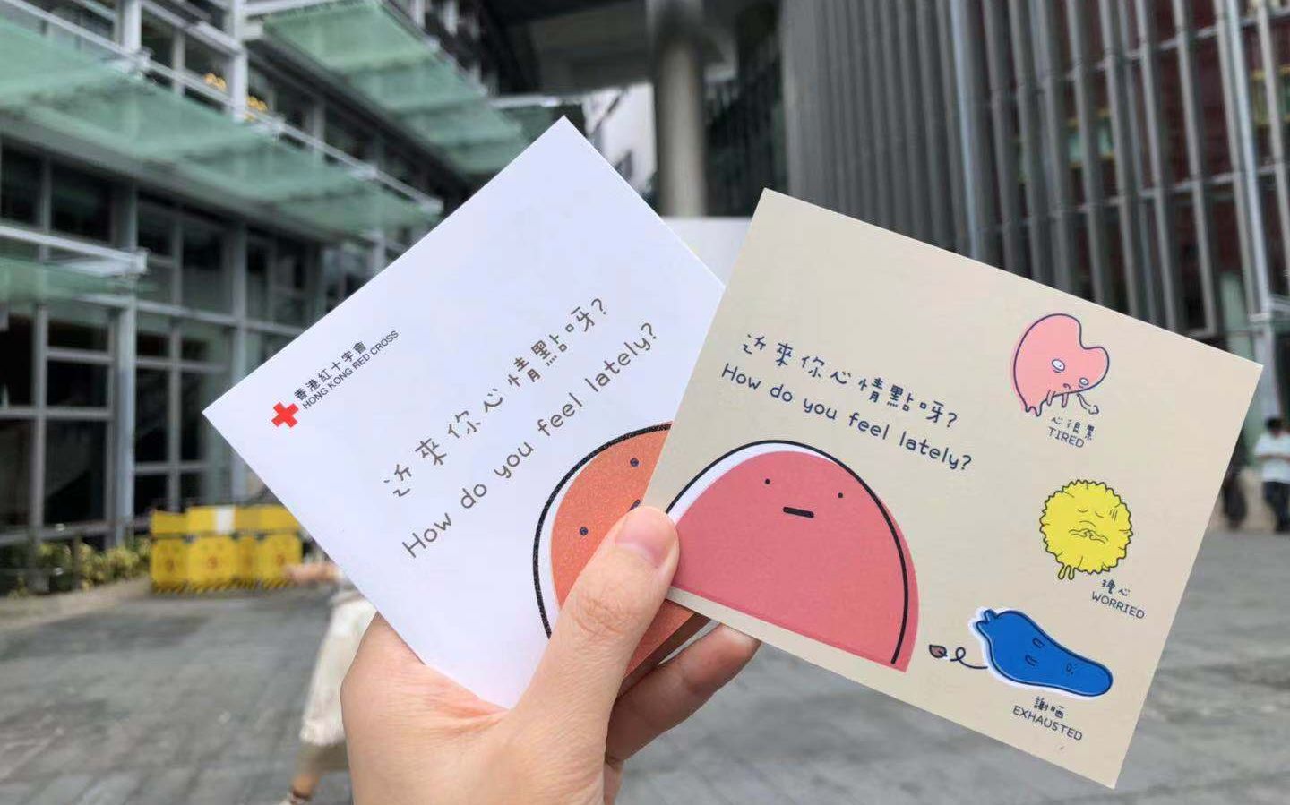 红十字会工作人员在校园内发放心理支援传单,上面写着“近来你心情点呀?(近来你心情如何?)”,传单上还有心理健康管理情绪的建议,以及寻求专业人士帮助的联系方式。