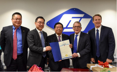 俄亥俄州长德万恩(右二)向曹德旺(中)授予俄亥俄州政府表彰信,中国驻纽约总领事黄屏(左二)、俄亥俄州副州长赫斯特德(右一)、福耀北美集团总裁刘道川(左一)参加了颁发仪式。
