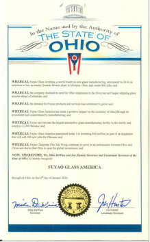 新京报讯(记者 侯润芳)距离纪录片《美国工厂》引发的热议四个多月后,福耀集团董事长曹德旺获得了俄亥俄州政府颁发的表彰信。新京报记者从福耀集团获悉,2020年1月6日,美国俄亥俄州州长迈克·德万恩(Mike DeWine)、副州长乔恩·赫斯特德(Jon Husted)在位于代顿市的福耀美国公司,代表俄亥俄州政府向福耀玻璃工业集团董事长、创始人曹德旺先生颁发表彰信,以表彰曹德旺对该州发展所做的贡献。据曹德旺在颁发仪式上介绍,福耀美国公司创造了2300多个工作岗位,还带动相关产业3800多个就业岗位。