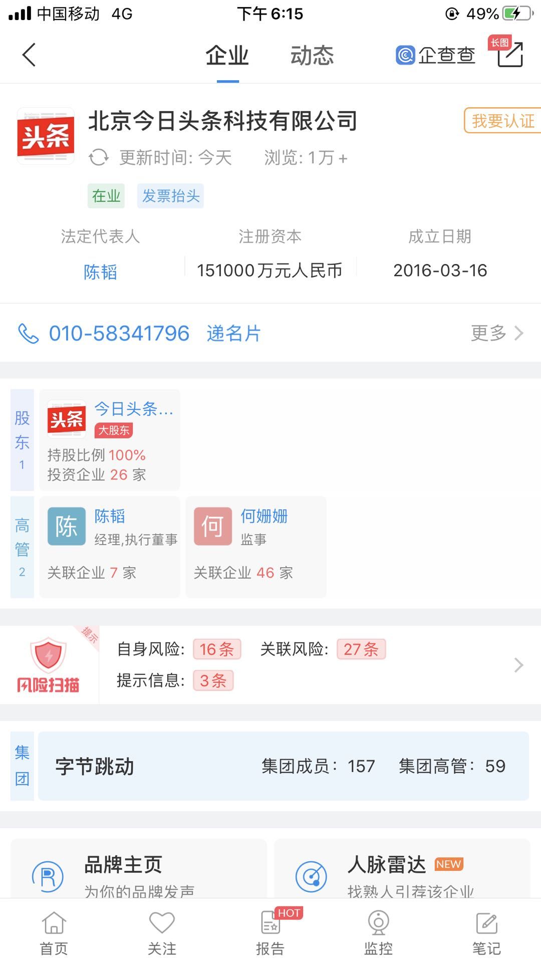 该公司成立于2016年3月,法定代表人为陈韬,是字节跳动有限公司全资子公司,实际控制人、最终受益人均为张一鸣,持股比例98.81%。