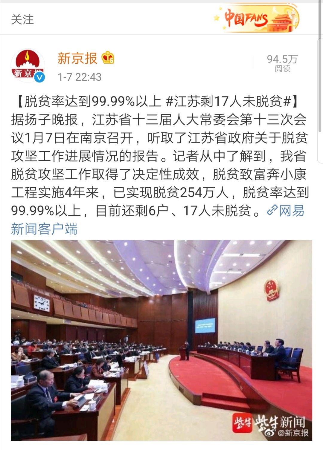 新京报快讯(记者 马瑾倩)昨日,江苏省发布了关于脱贫攻坚工作进展情况的报告,其中提到,江苏省脱贫率达到99.99%以上,目前还剩6户、17人未脱贫,立刻在网络引发热议。有网友疑惑,为何江苏省贫困标准为年人均收入6000元,比其他省份高出不少;为何不给未脱贫的17人每人发6000元现金,实现全省脱贫?