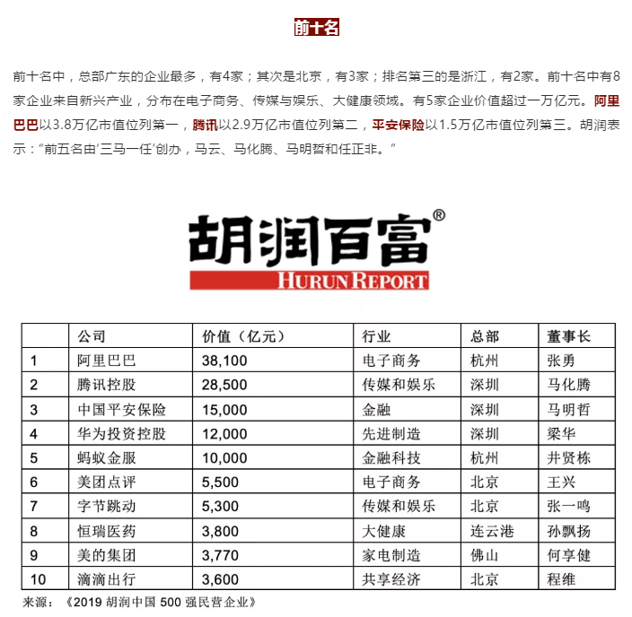 值得注意的是,这里的“中国民营企业”是指总部在中国大陆的非公有制企业。上市公司企业市值按照2019年11月29日的收盘价计算,非上市公司企业估值参考同行业上市公司进行估算。这是胡润研究院首次发布该榜单。