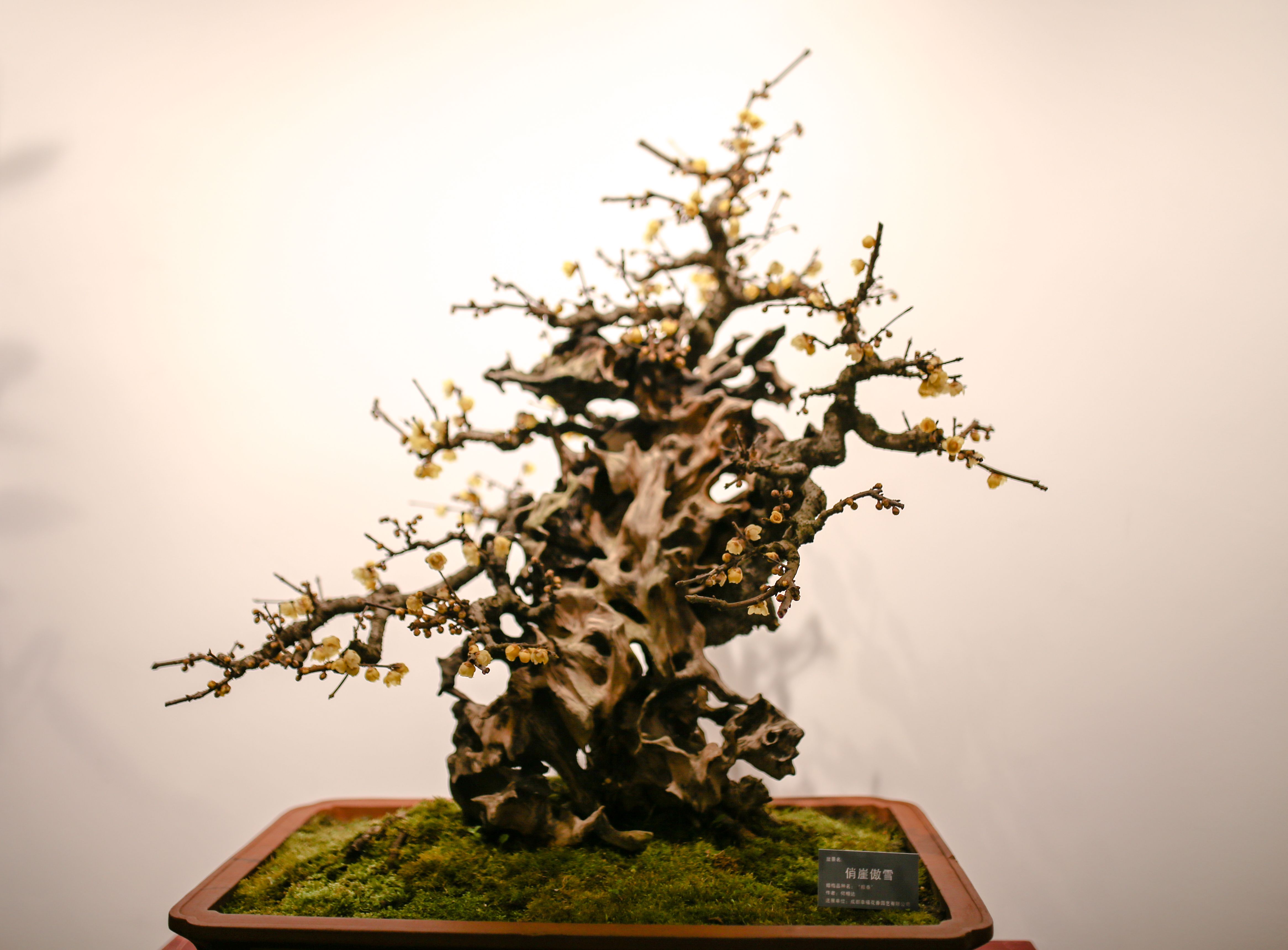 论资历,科普展示中心的盆栽“俏崖傲雪”当仁不让。这盆蜡梅品种为“报春”,树龄超过200年,来自成都幸福梅林。除此之外,在展览温室的四季花厅,还有两盆盆栽蜡梅年过百岁,一盆同为“报春”,取名“只留清气满乾坤”;另一盆蜡梅的品种为“幸福花香”,取名“大鹏展翅”。