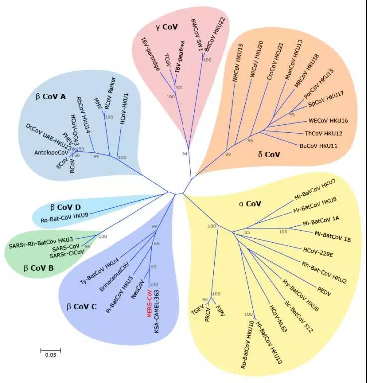 根据系统发育树,冠状病毒可分为四个属:α、β、γ、δ,其中β属冠状病毒又可分为四个独立的亚群A、B、C和D群。