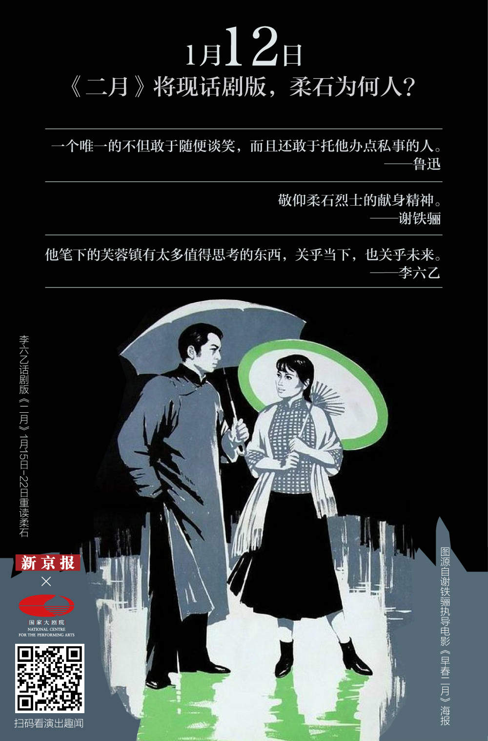 此次话剧版《二月》由李六乙执导,他在看过原著,研究柔石其人后表示:“他笔下的芙蓉镇有太多值得思考的东西,关乎当下,也关乎未来。”电影导演谢铁骊执导的电影《早春二月》就是改编自柔石的《二月》,由孙道临 、谢芳主演,该片已成为影史经典影片之一,本期日签的图片就来自于电影《早春二月》的海报。