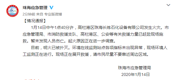 新京报快讯 据珠海市应急管理局消息,1月14日中午1点40分许,高栏港区珠海长炼石化设备有限公司发生火灾。市应急管理局、市消防救援支队、高栏港区、公安等有关救援力量已赶赴现场施救。