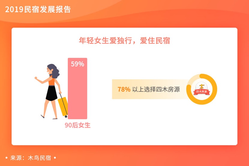 木鸟民宿数据显示,2019年,单次入住民宿天数在1-2天的用户占比过半(58%),一人出行住民宿的比例增幅明显,其中90后女生占比59%。在房源的挑选上,78%的用户会选择平台的优选房源,为自己的旅行住宿品质加码。从后台数据来看,木鸟平台上不同年龄层用户对民宿的关注点也不尽相同。年轻的00后更看重民宿颜值;90后更在意民宿位置及周边景点;80后一般更关心民宿的户型及功能设施;而70后多为赋闲人群,入住时间相对长一些,更关注价格。
