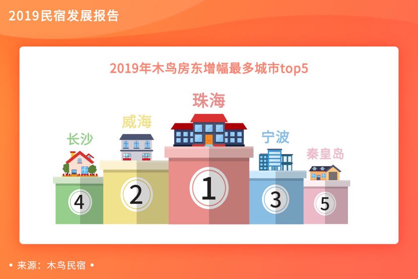 随着用户对民宿行业和民宿房东的认可度提升,越来越多的人也在加入民宿房东行列。从木鸟2019年民宿发展报告数据来看,平台房东增幅前五名的城市分别为珠海、威海、宁波、长沙、秦皇岛,其中三线城市有3个。民宿市场下沉的大趋势下,三线城市民宿潜力巨大。