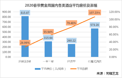春节黄金周期间,低星酒店、经济型酒店和公寓式酒店的需求量最大,合并占比50%以上。庞大的需求推动酒店房价大幅攀升。来自同程艺龙的住宿大数据显示,全国主要城市酒店平均房价都在500元/间夜以上,公寓式酒店的平均房价为573.2元/间夜,较平日(最近一个月内非节假日的平均价格,下同)上涨了107.23%;经济型酒店的平均房价为260.22元/间夜,较平日上涨了79.48%;一星至三星酒店的平均房价为315.64元/间夜,较平日上涨了55.94%;四星及五星酒店的平均房价为815.87元/间夜,较平日上涨了26.99%。