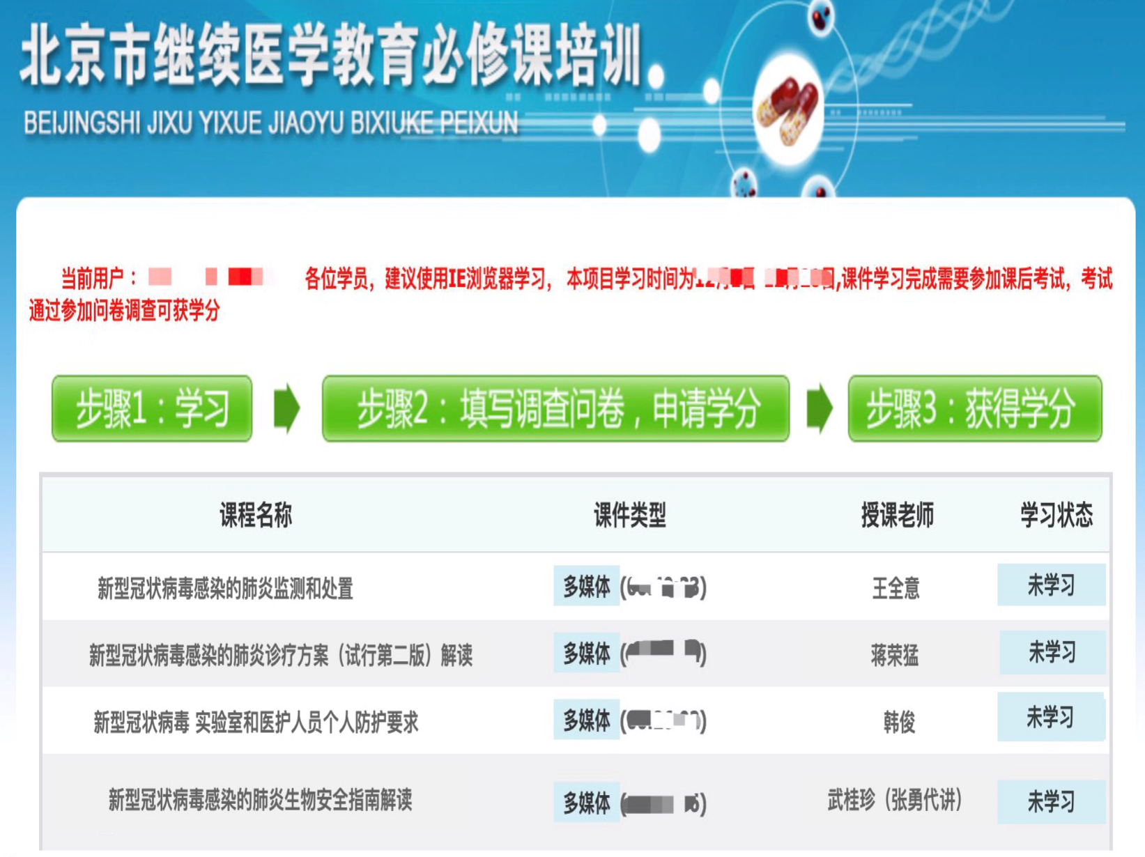 昌平区一家三甲医院呼吸科医生告诉记者,他上周接到通知,参加了相关线上培训。记者在由北京市卫生健康委员会、北京预防医学会主办的北京市继续医学教育必修课平台上看到,“2020年新型冠状病毒感染的肺炎防治知识全员培训”课程排在首位,共有新型冠状病毒感染监测和处置等4个课程,其中包括“新型冠状病毒 实验室和医护人员个人防护要求”。
